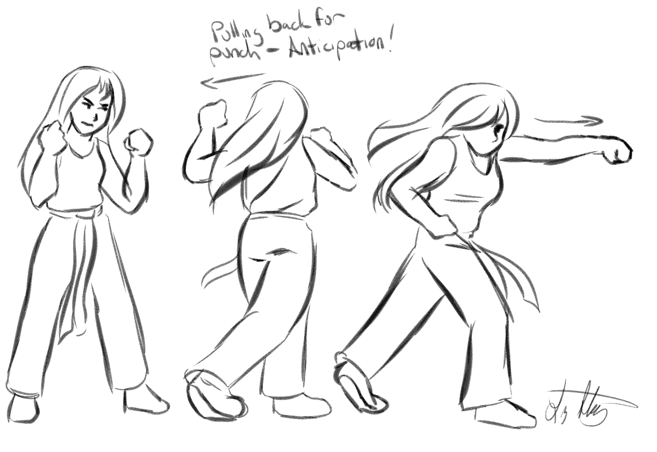 La anticipación es utilizada para preparar al público para una acción. Imitando el comportamiento humano, los personajes se estabilizan o realizan movimientos previos antes de llevar a cabo una acción principal. Este principio aporta un mayor nivel de realismo y prepara al espectador para lo que está por venir.